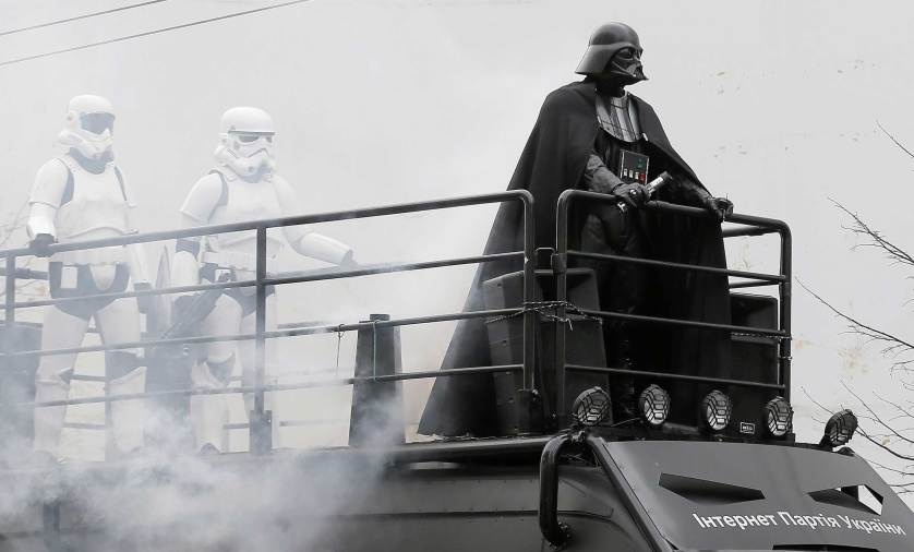 Một nhân vật đối lập trong cuộc khủng hoảng chính trị ở miền đông Ukraine hồi đầu năm 2014 gây chú ý khi mặc bộ trang phục như nhân vật Darth Vader trong bộ phim Star Wars. Người này ứng cử vào vị trí thị trưởng Kiev và Odessa và xuống đường vận động tranh cử theo cách độc nhất vô nhị hôm 21/10. Darth Vader là thành viên đảng Internet Ukraine và từng ứng cử cương vị tổng thống Ukraine nhưng không được chấp thuận. Ảnh: EPA |