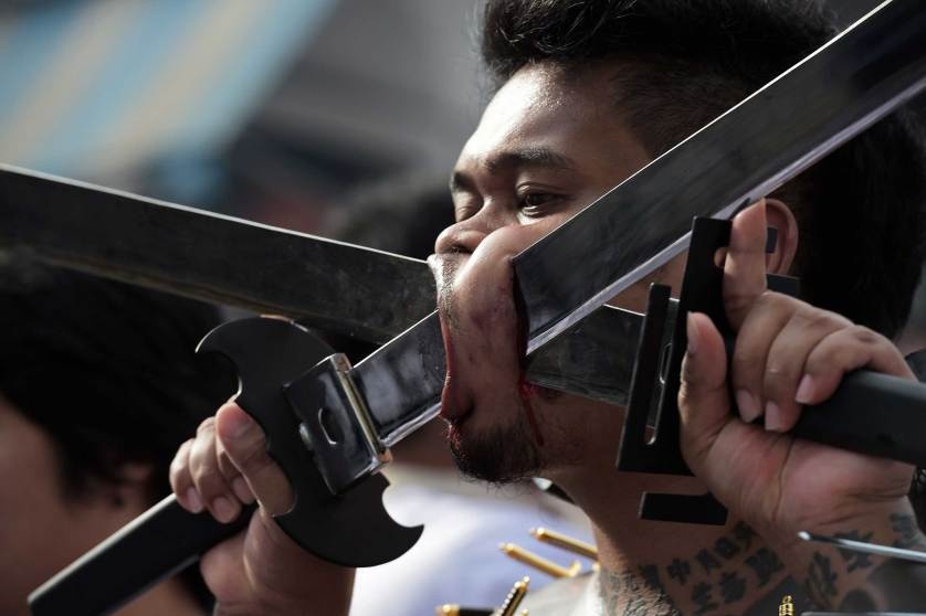Người mộ đạo thể hiện màn hành xác trong lễ hội hoa quả thường niên ở Phuket, Thái Lan. Ảnh: Getty |