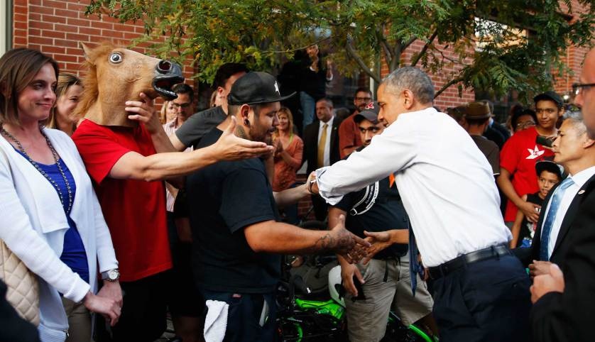 Người đàn ông đội chiếc mặt nạ đầu ngựa chuẩn bị bắt tay Tổng thống Mỹ Barack Obama ở Denver. Ảnh: Reuters |