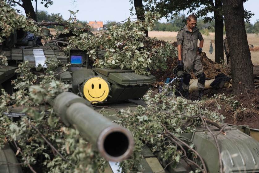 Lính Ukraine trang trí cỗ xe tăng hình mặt cười khi tiến tới Pervomaysk, khu vực Lugansk, miền đông Ukraine. Ảnh: Reuters |