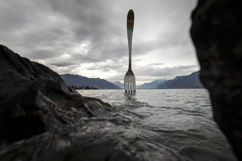 Chiếc dĩa khổng lồ được Jean-Pierre Zaugg dựng trên hồ Geneva, Thụy Sĩ hôm 17/10. Ảnh: Getty |