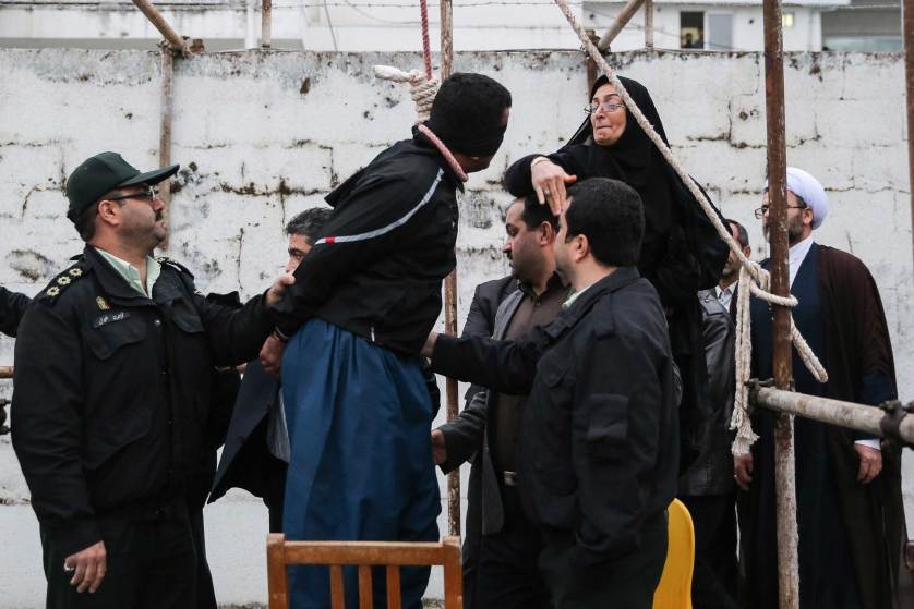 Một người mẹ mất con tự tay tát hung thủ khi hắn bị đưa lên giá treo cổ ở Nowshahr, Iran ngày 15/4. Ảnh: Getty |