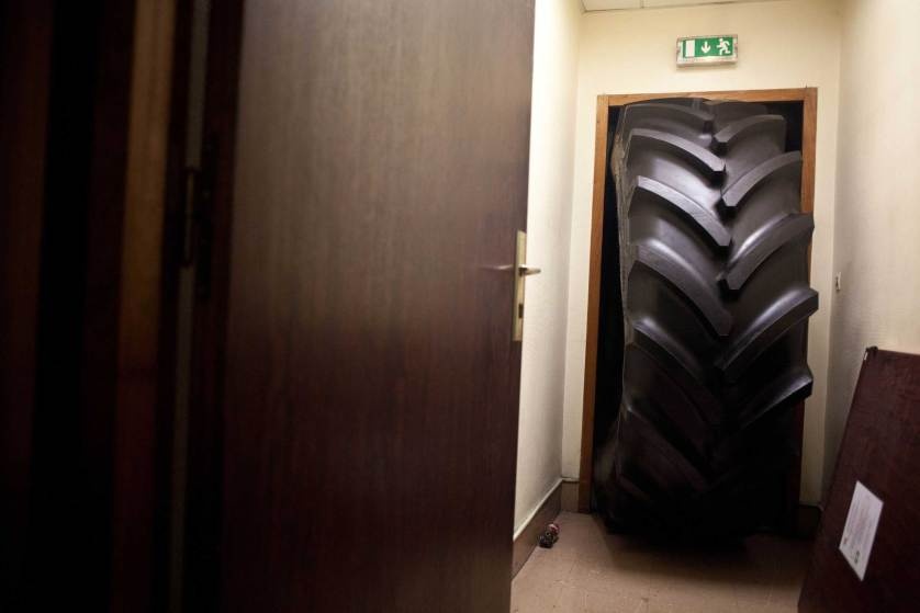Lốp xe khổng lồ chặn cửa tại nhà máy Goodyear, Amiens, Pháp nhằm bắt giữ hai lãnh đạo công ty để thể hiện sự bất đồng. Ảnh: Nurphoto |