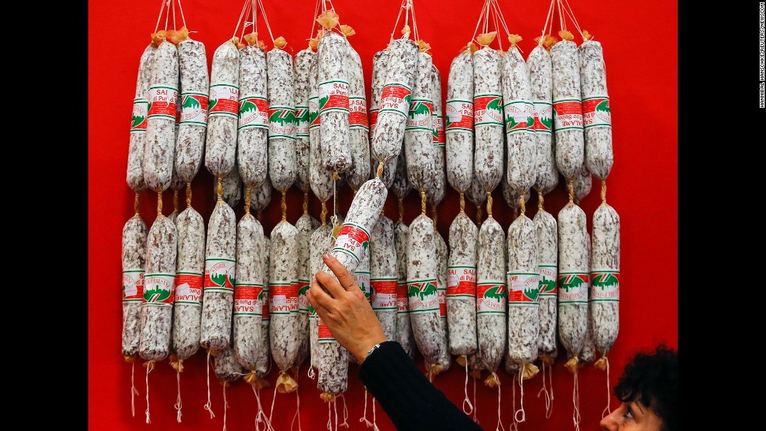 Berline, Đức: Một nghệ sĩ người Italy treo xúc xích salami ở lễ hội ẩm thực Green Week được tổ chức từ 15-24/1. Sự kiện thu hút hơn 400.000 người tới tham dự mỗi năm. |