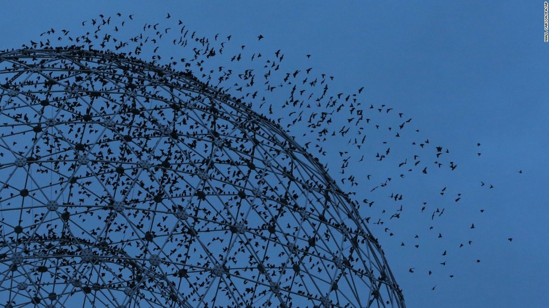 Belfast, Bắc Ireland: Chim sáo đá bay quanh Rise, một tác phẩm bằng kim loại của nghệ sĩ Wolfgang Buttress. Công trình này được đặt ở vòng xoay Broadway ở Belfast từ 2011. |