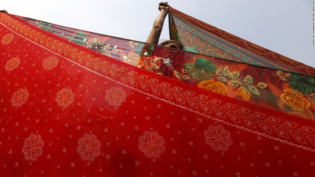 Kolkata, Ấn Độ: Một tín đồ đạo Hindu treo các tấm sari sau khi thực hiện lễ hội tắm thường niên trên đảo Sagar vào ngày 14/1. Đây là một nghi thức nằm trong lễ hội Makar Sankrati được tổ chức khắp Ấn Độ, Nepal và Bangladesh. |