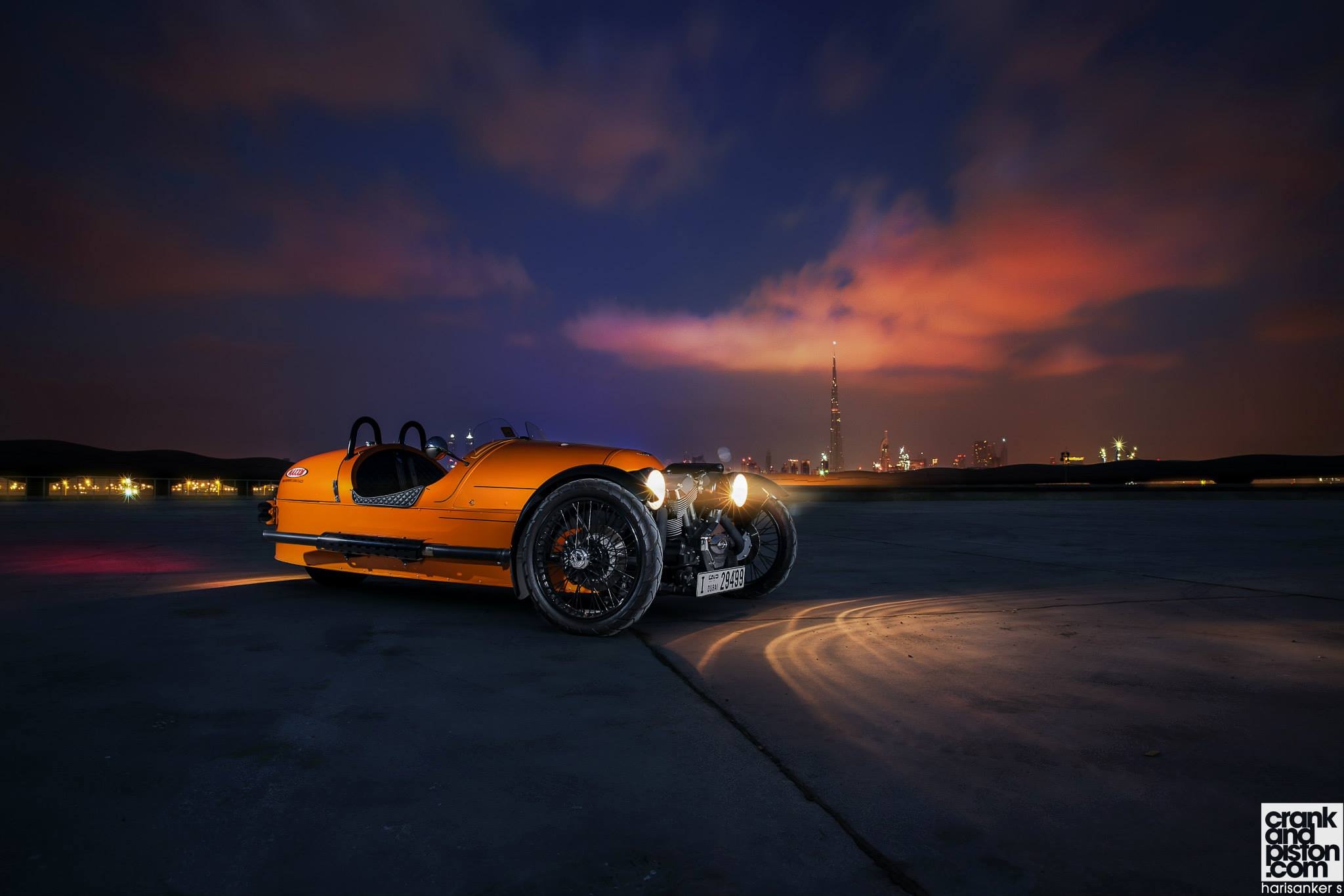 | Siêu xe 3 bánh Morgan tỏa sáng trong bóng đêm. |