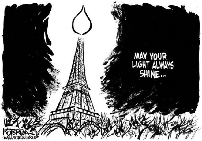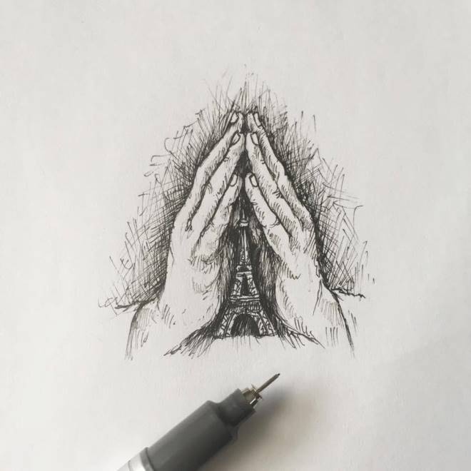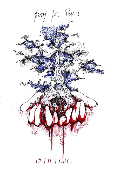 | Một trong những bức vẽ chứa đựng nhiều cảm xúc của Kerby Rosanes, với tên gọi Khẩn nguyện cho Paris. |