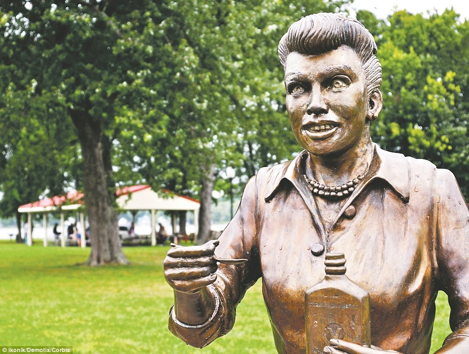 Lucille Ball, Celoron, New York, Mỹ: Bức tượng của nữ diễn viên Lucille Ball, người nổi tiếng toàn cầu sau loạt phim “Tôi yêu Lucy” vào những năm 1950, được làm bằng đồng, nặng 180 kg. Tượng phỏng theo tập phim năm 1952, khi Lucy đóng quảng cáo cho loại thuốc bổ có tên Vitameatavegamin. |