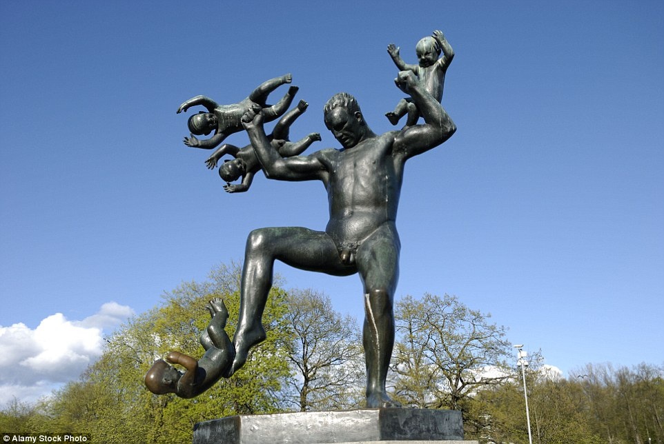 Tượng Người đàn ông bị trẻ con tấn công, Oslo, Na Uy: Đây chỉ là một trong 200 tác phẩm điêu khắc của Gustav Vigeland được trưng bày ở công viên Vigeland. Thật khó hình dung bức tượng người đàn ông khỏa thân đang đá một đứa trẻ này có ý nghĩa gì. |