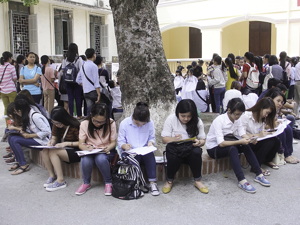 | Sinh viên xếp hàng dài để đăng ký ứng tuyển tại "Ngày hội việc làm 2015". |
