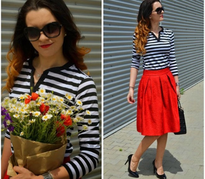 | Gam đỏ nổi bật của chân váy cũng có thể kết hợp cùng áo thun kẻ. |