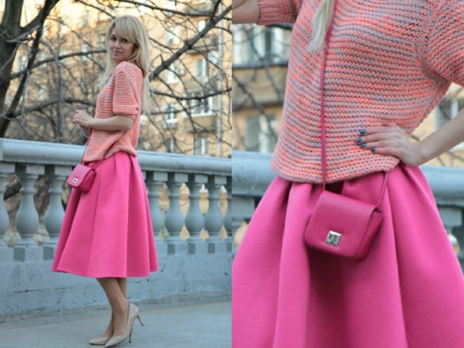 | Vào mùa lạnh bạn cũng có thể mix chân váy hồng với áo len. Một chiếc túi xách đồng màu sẽ mang lại vẻ đáng yêu cho bạn. |