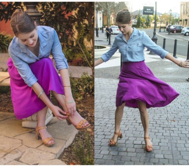 | Màu tím mix cùng áo sơ mi denim cho cô nàng lãng mạn. |