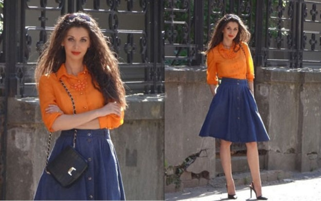 | Chân váy xanh than đính cúc mang vẻ đẹp cổ điển đậm phong cách retro. Kết hợp cùng sơ mi cam sẽ giúp bạn gái nổi bật, ấn tượng hơn. |