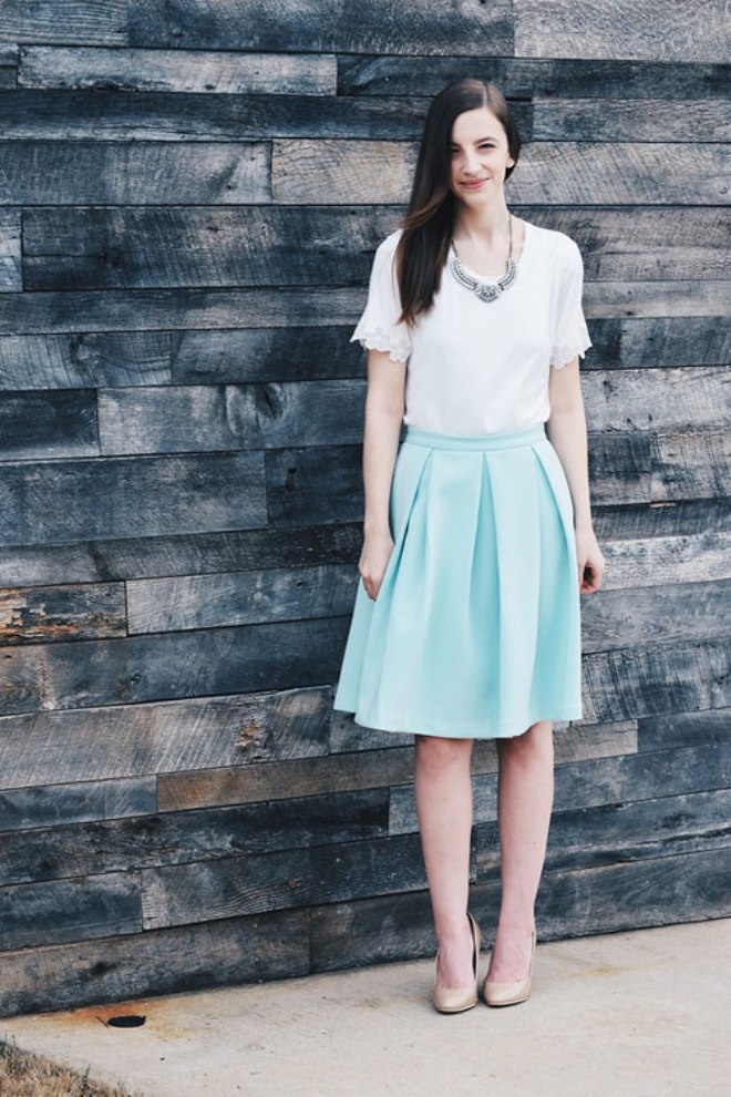 | Chiếc váy màu vàng có thể phối cùng áo thun kẻ ngang đen trắng. |