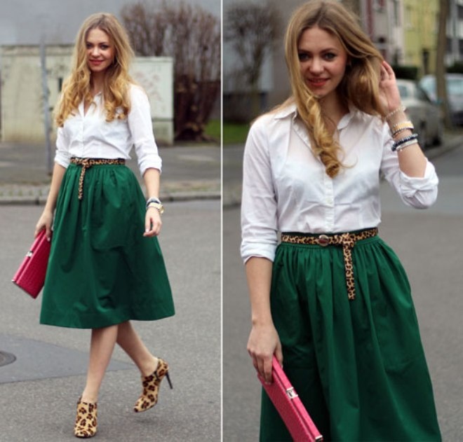 | Màu xanh lá cây kết hợp cùng sơ mi trắng cho cô nàng công sở. Set đồ mang đến cho bạn cảm giác tươi mới, mát mẻ. |