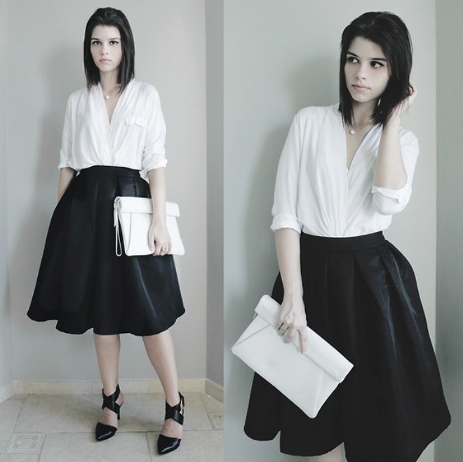| Bộ đôi chân váy midi đen mix cùng sơ mi trắng là xu hướng được nhiều bạn gái ưa chuộng. Giày cao gót và túi hand bag thời trang là những phụ kiện thích hợp nhất. |
