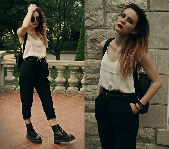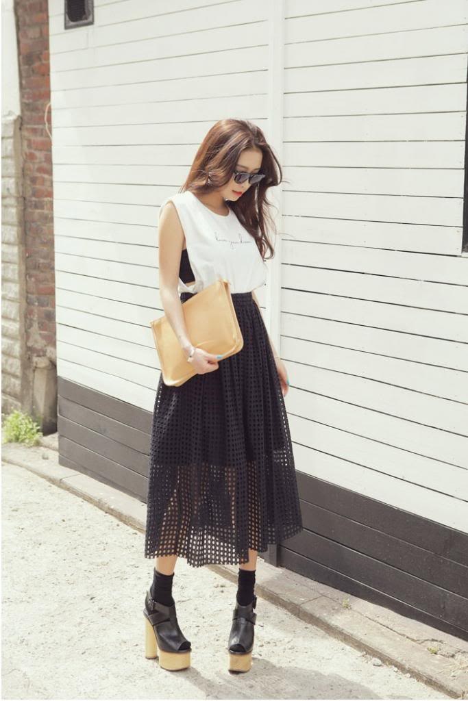 | Thêm một gợi ý nữa cho những cô nàng sành điệu: Tank-top khoét nách được mix với áo quây. Bộ trang phục siêu cá tính, khai thác sự sexy vừa đủ với những khoảng hở của chân váy theo xu hướng eyelet. Hoàn thiện cho set đồ black and white này là giày đế thô và tất lửng cùng màu. |