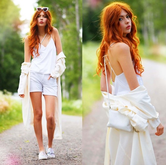| Set đồ phối theo white on white khá tinh tế với sự hòa hợp của hai sắc độ trắng khác nhau và đôi giày slip on ánh kim nổi bật. |