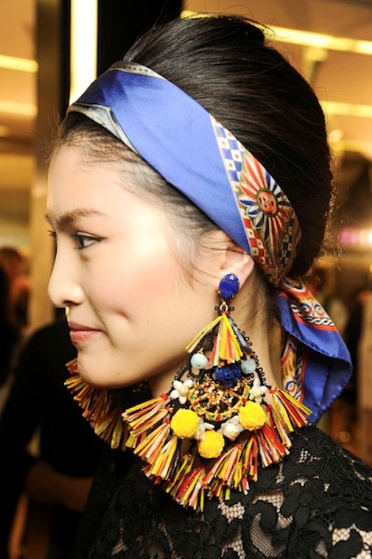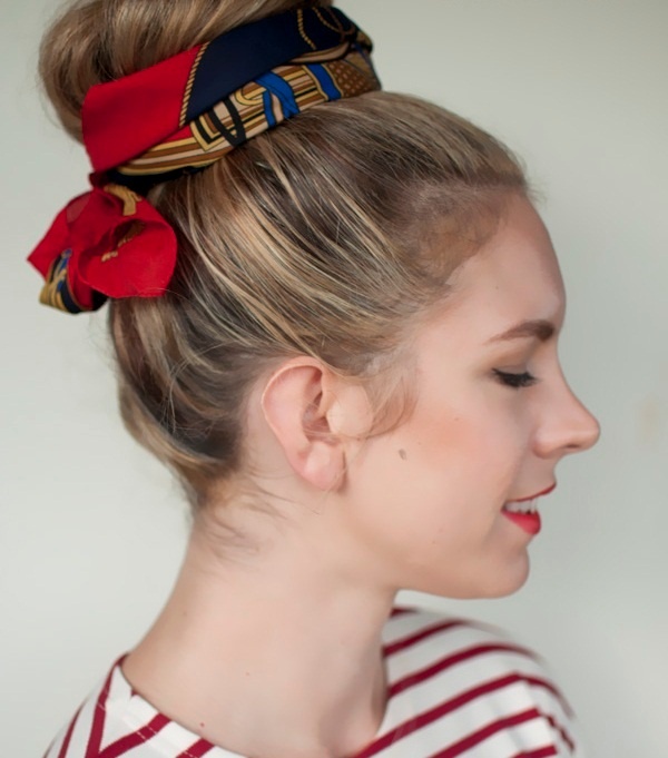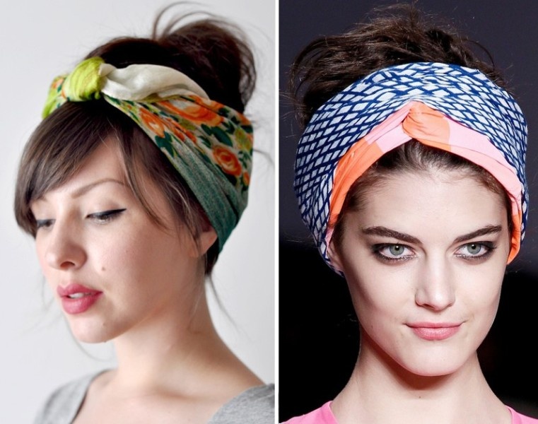Chiếc khăn đáng yêu trong tủ của bạn có thể được đưa ra sử dụng lần nữa với việc biến nó thành chiếc băng đô quấn tóc xinh xắn. Ngoài việc cuốn gọn hết toàn bộ tóc tạo nên vẻ đẹp năng động, lạ mắt, khăn quàng cổ còn có thể trở thành những chiếc dây buộc tóc thú vị. Với nhiều bạn gái có khả năng sáng tạo, đây là phụ kiện tuyệt vời để sử dụng cùng mái tóc của mình.