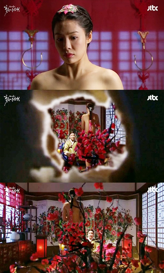 | Cảnh nữ diễn viên Kim Hyun Joo cởi áo để lộ toàn bộ cơ thể trong bộ phim cổ trang Cruel Palace-War of Flowers gây xôn xao cho người xem. Đây là phân đoạn nhân vật của Kim Hyun Joo phải để trần để khám xét trước khi vào gặp nhà vua. Ống kính máy quay khéo léo để chi tiết này không trở nên phản cám với khán giả. |