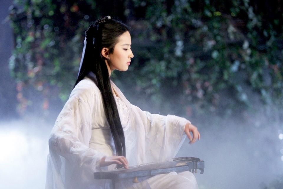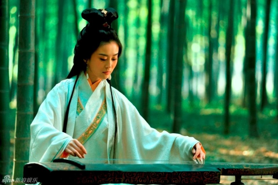 | Lưu Diệc Phi "lạnh như băng" ngồi chơi đàn giữa Cổ Mộ trong "Thần điêu đại hiệp". |