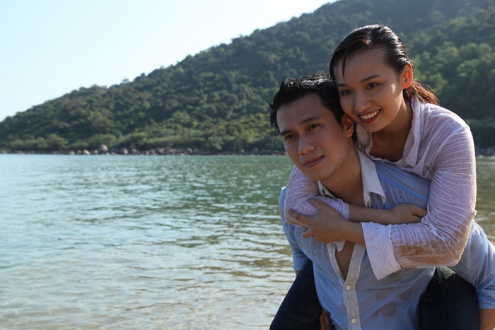 Cảnh Việt Anh cõng Lã Thanh Huyền đi trên bờ biển. Trước đó anh đã cứu cô thoát chết khi cô vô ý bị rơi xuống biển.