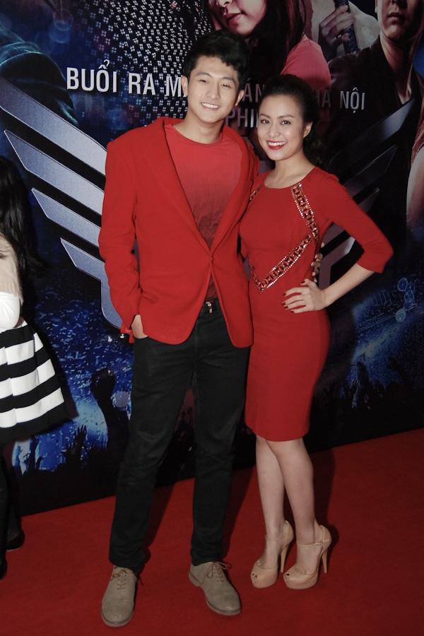 Trang phục gam đỏ đồng bộ giúp Hoàng Thùy Linh tự tin khi đứng cạnh bạn trai diện vest và áo thun đỏ bắt mắt.