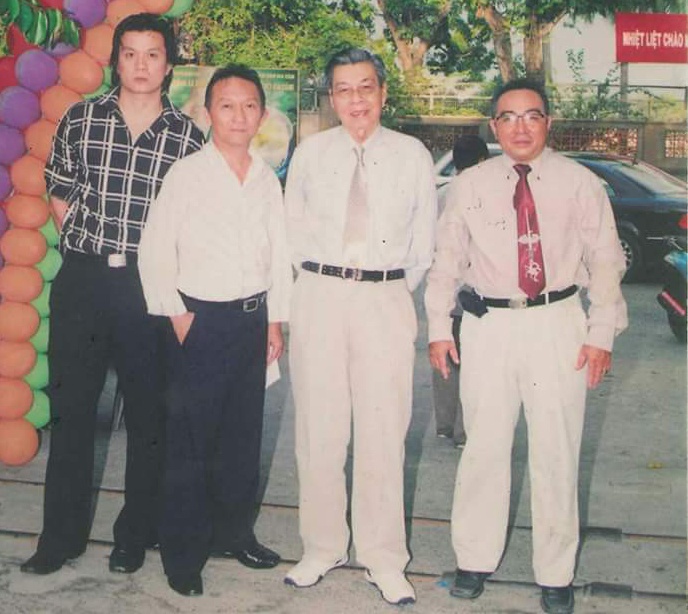 Ông Đinh Duy Ngọc (áo xám đeo cà vạt) làm chung phim với đạo diễn Lê Dân (ngoài cùng bên phải) trong năm 2003, từ đó họ gắn bó với nhau từ trong công việc đến cuộc sống. Ảnh: NVCC. |