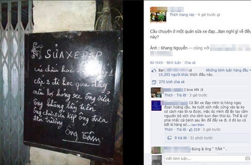 Mới đây, nhiều bạn trẻ đã chia sẻ câu chuyện về cụ Nguyễn Văn Tâm (61 tuổi, Thanh Trì, Hà Nội) nhiều năm liền sửa xe miễn phí và đưa các học sinh tới trường. Bức ảnh thông báo sửa xe đạp miễn phí giúp các bạn học sinh cấp 1, cấp 2 của cụ Tâm đã gây xôn xao: “Các cháu học cấp 1, cấp 2 đi học qua đây nếu bị hỏng xe ông sửa, ông không lấy tiền. Ông chưa sửa kịp, ông đưa đến trường”.