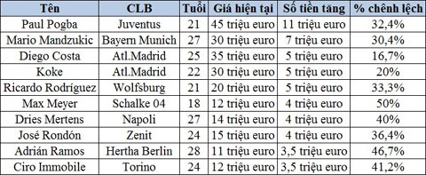Top 10 cầu thủ tăng giá mạnh nhất sau mùa giải vừa qua