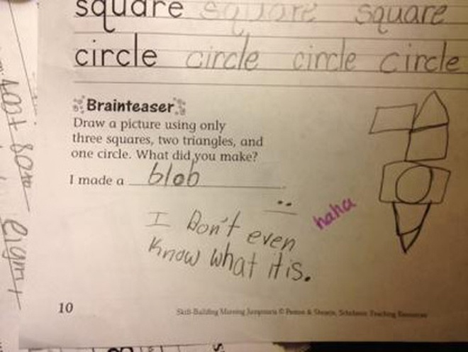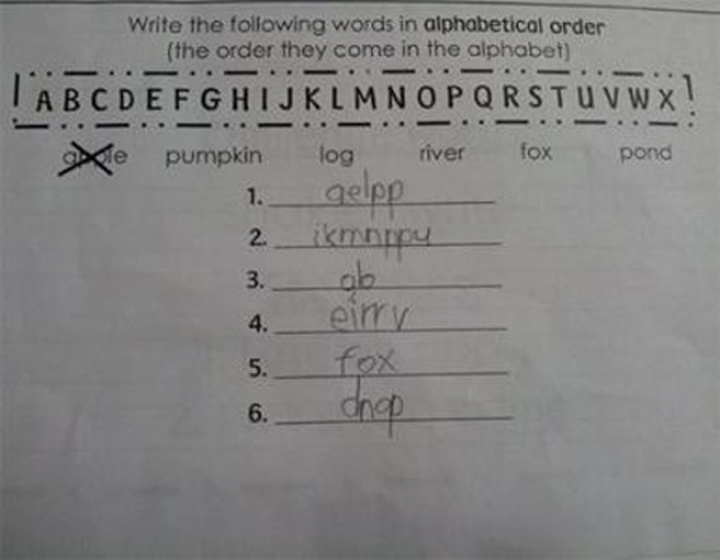 Yêu cầu: Hãy viết những từ bên dưới theo thứ tự xuất hiện trong bảng chữ cái. Trả lời: Thay vì sắp xếp các từ, cậu bé này lại sắp xếp các chữ cái trong một từ. |