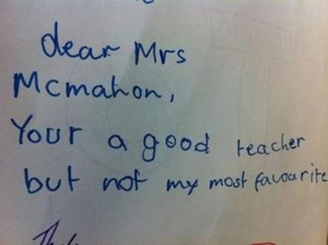 | “Cô Mcmahon thân mến. Cô là một cô giáo tốt nhưng không phải là giáo viên mà em thích nhất”. |
