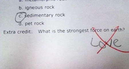 | Trong bài kiểm tra môn địa lý, lực hút nào mạnh nhất trên trái đất? Một học sinh đã trả lời rằng đó là tình yêu. |