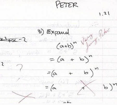 | Bài toán yêu cầu em hãy khai triển hằng đẳng thức (a+b)^n phía dưới (‘expand’ : mở rộng, triển khai)? Và Peter đã ‘expand’( mở rộng) nó theo đúng nghĩa đen. |