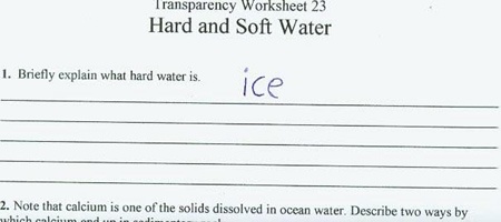 | Hãy giải thích một cách ngắn gọn về nước cứng. Thay vì giải thích rằng nuớc cứng là một chất trong hóa học, loại nước có chứa hàm lượng Ca và Mg thì cậu bé đã trả lời là băng đá. |