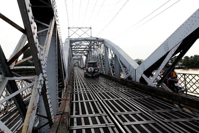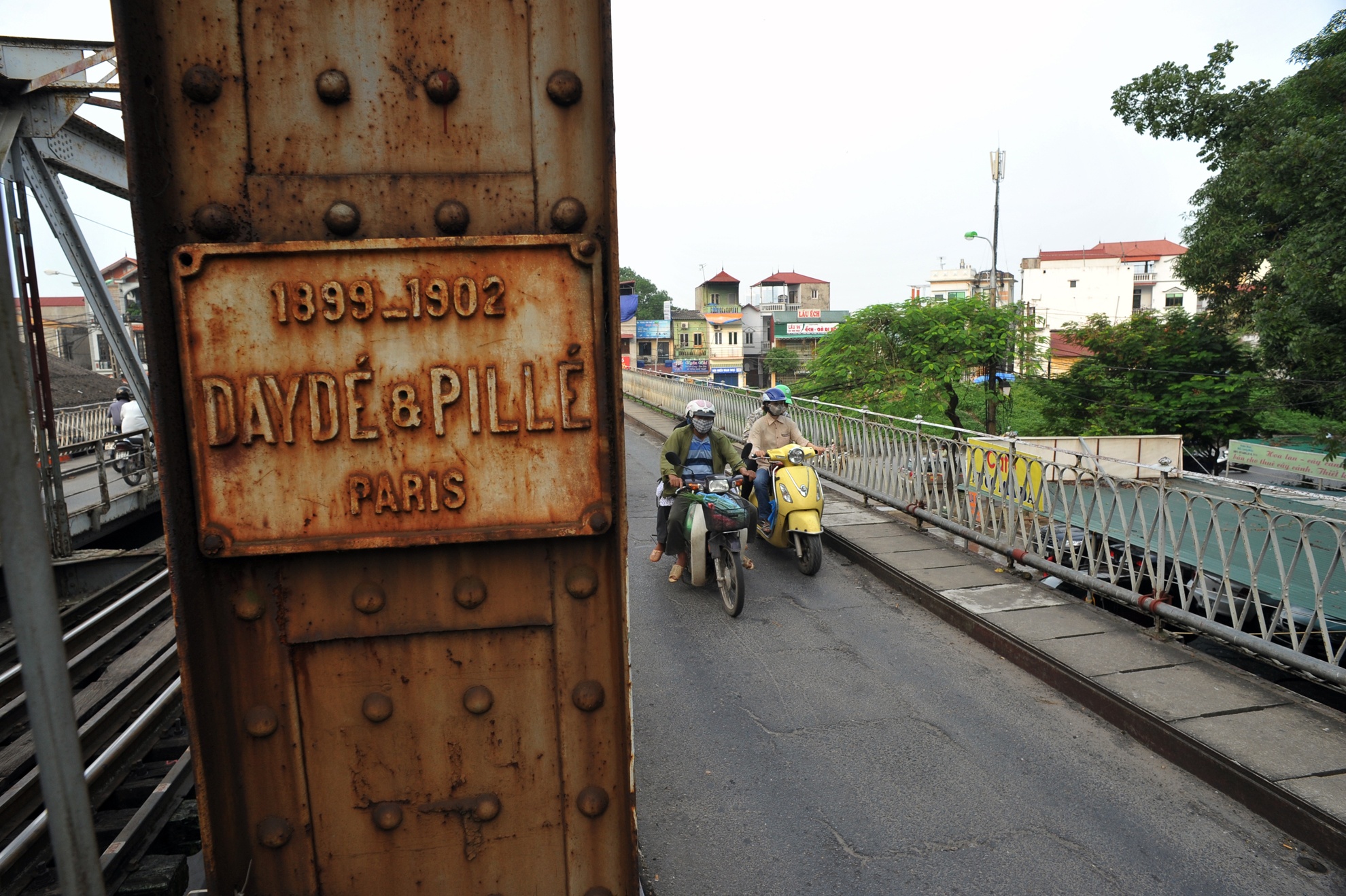 Cầu có đường sắt chạy ở giữa, hai bên là đường cho người đi bộ và xe cơ giới. Hiện trên đầu cầu vẫn còn tấm biển có khắc chữ "1899 -1902 - Daydé & Pillé - Paris". Ảnh: Hoàng Hà - Tuấn Mark. |