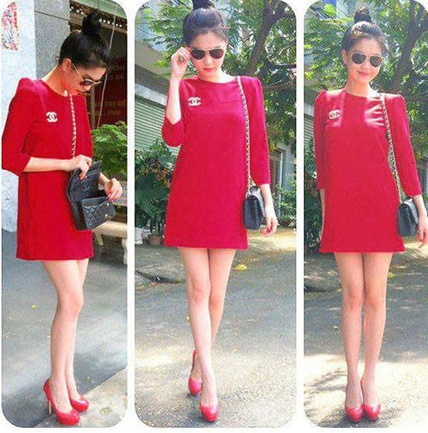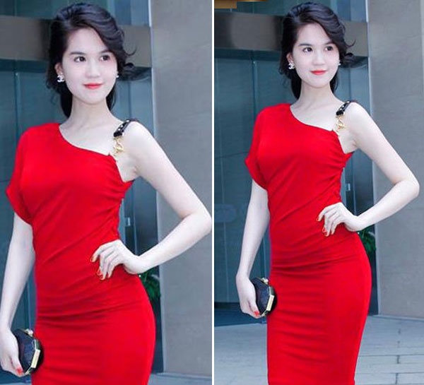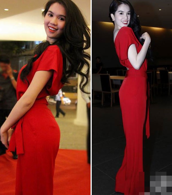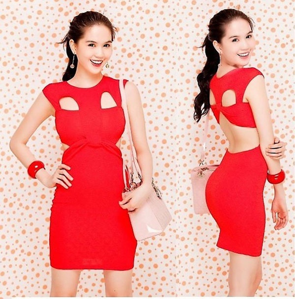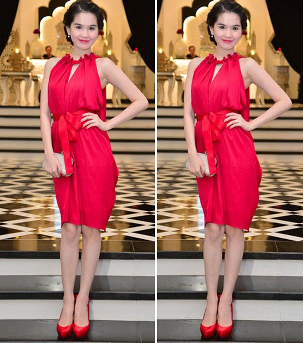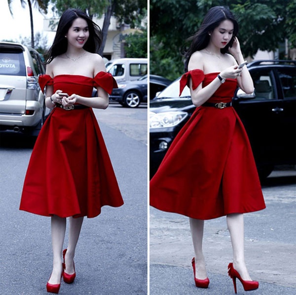 | Chiếc váy đỏ thiết kế sun nhún cổ và thắt nơ tại eo tạo điểm nhấn cho vóc dáng Ngọc Trinh. |