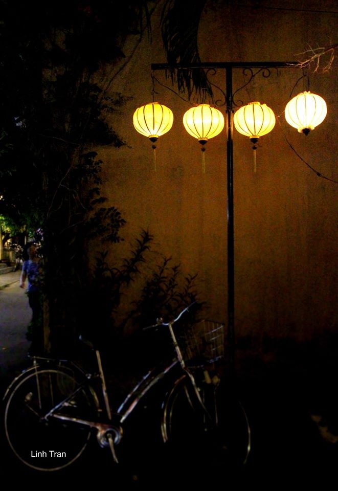 Tôi dừng chân bên bức tường nơi góc phố. Màu vàng đất đặc trưng của Hội An (Quảng Nam) ánh lên trên tường vôi rêu phong. Vài chiếc đèn lồng hình quả bí lửng lơ trên đầu, rọi một thứ ánh sáng huyền ảo xuống chiếc xe đạp ai đó dựng vội. Bức tranh tĩnh vật đêm phố cổ, bình yên đến nao lòng. Đầu con hẻm nhỏ, hiếm hoi một chiếc đèn điện trong hình dáng của đèn lồng, rọi sáng những sợi dây chằng chịt trên cột điện, gợi lên quá nhiều suy nghĩ về thời gian và sự đổi thay.