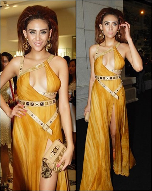 | Ngọc Oanh khiến những người xung quanh trố mắt bởi chiếc váy xẻ vô tội vạ. |