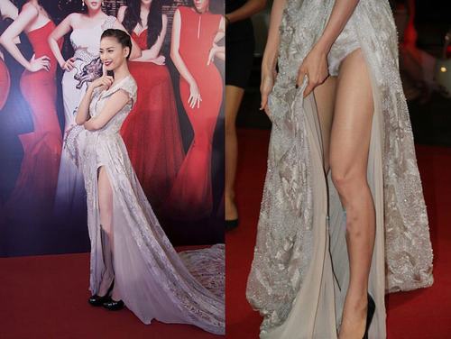 | Đáng lẽ bộ đầm xẻ của Chung Thục Quyên sẽ không có gì đáng nói nếu như người đẹp không vung tay quá đà, khiến đôi chân của cô lộ ra. |