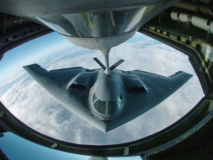 | B-2 Spirit là loại máy bay ném bom đa nhiệm được trang bị công nghệ tàng hình. Nó có thể mang theo bom thông thường hoặc bom hạt nhân. |