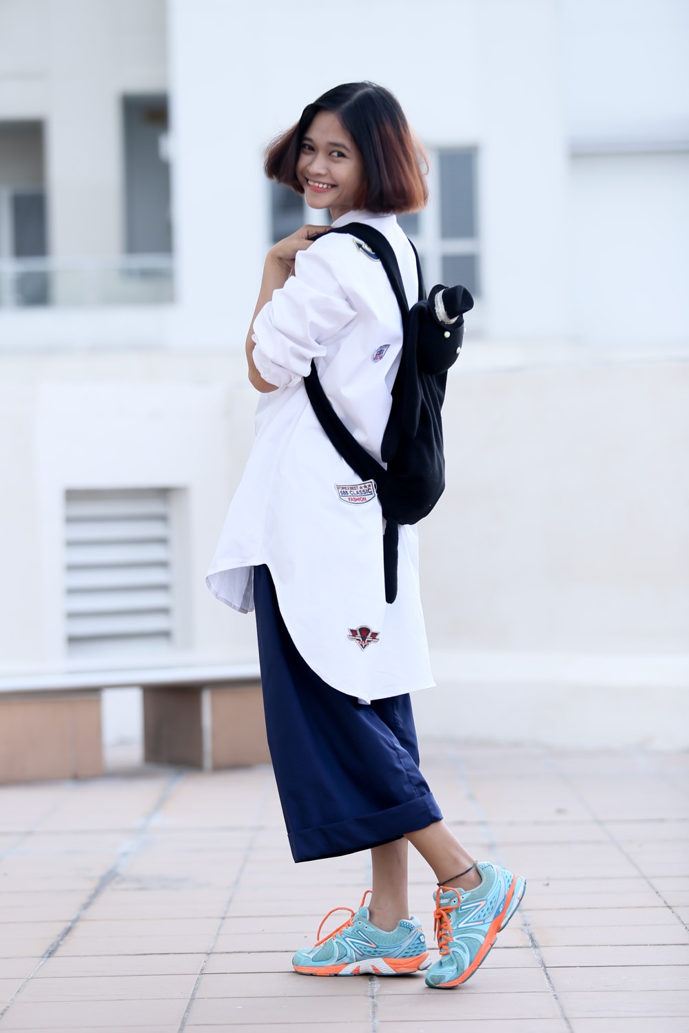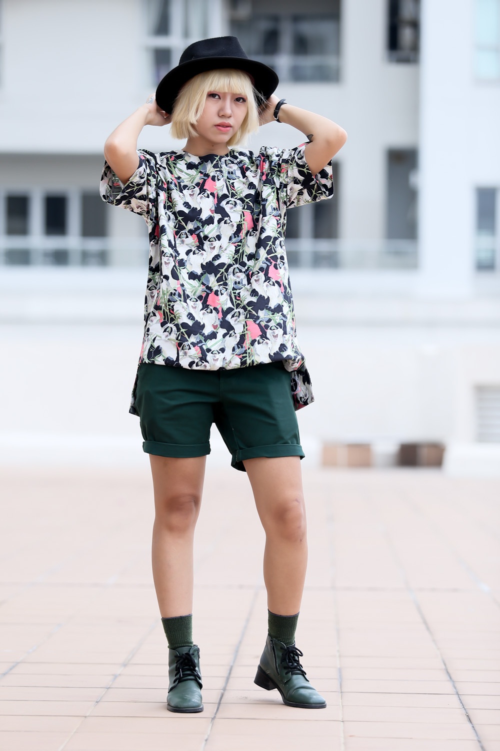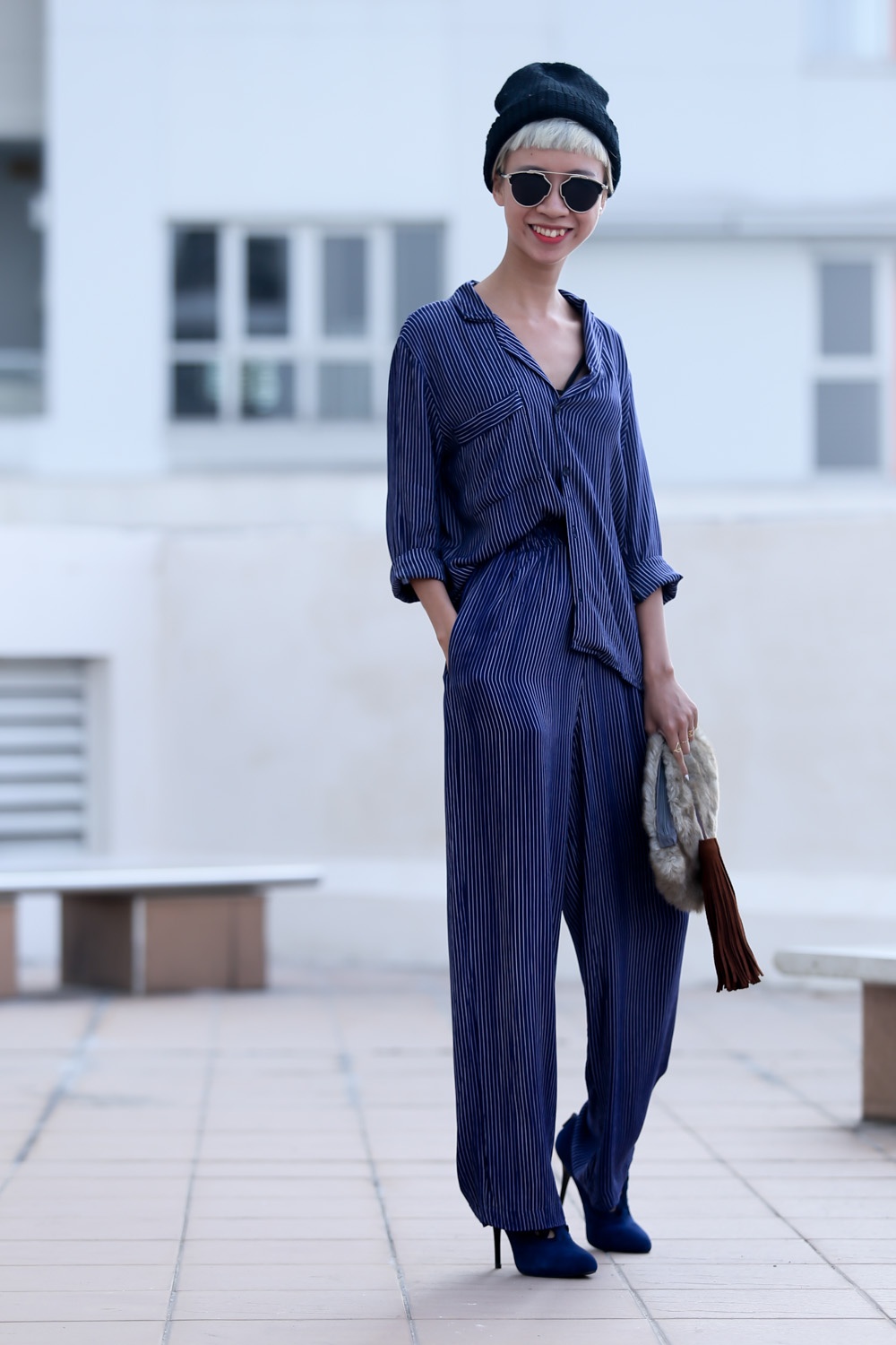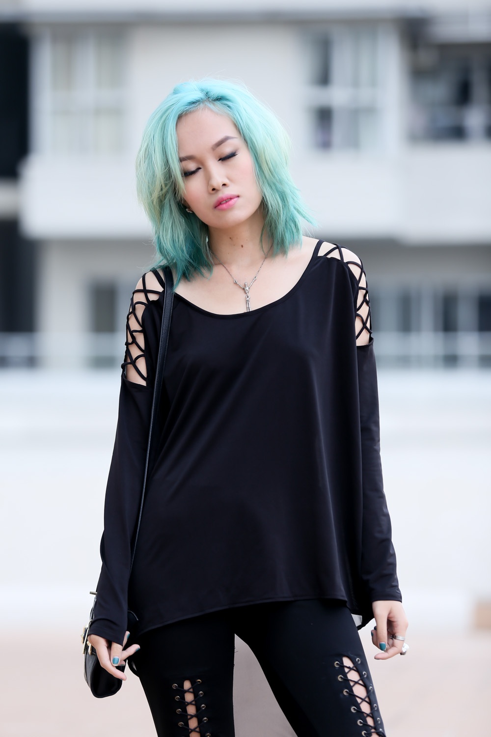 | Nổi bật trong nhóm 100 thí sinh là tín đồ thời trang có màu tóc nhuộm xanh cá tính. Cô gái này chuộng gam màu đen, có những điểm nhấn thắt buộc tại chân, tay áo. Phụ kiện đi kèm hợp mốt. |