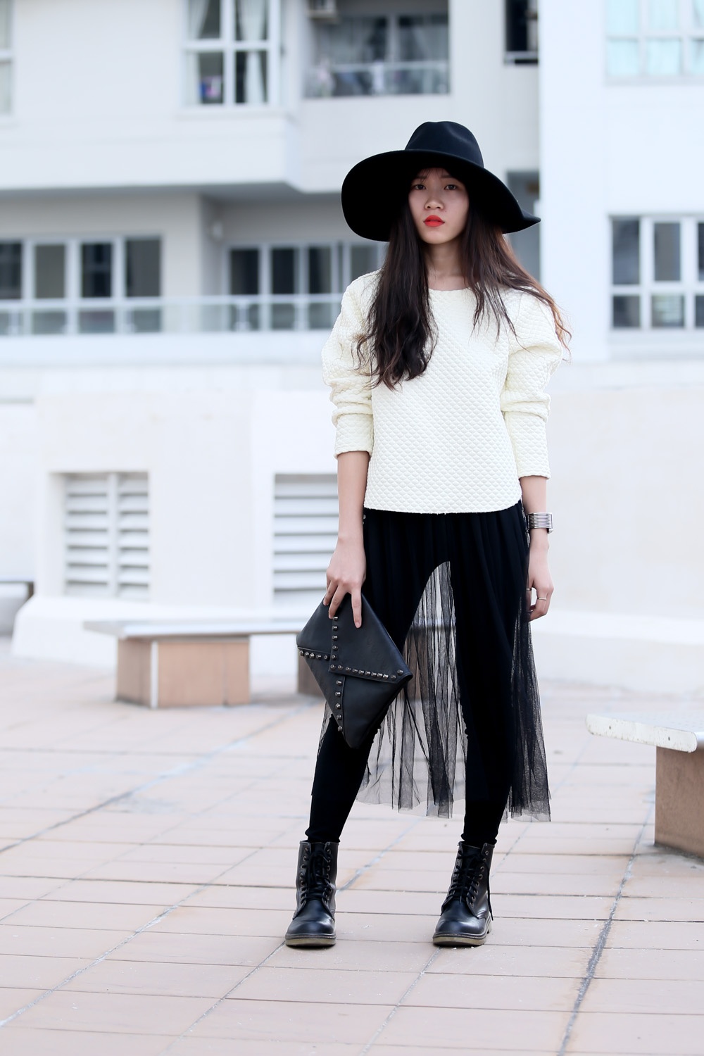 | Tín đồ nữ này cũng rất chuộng tông đen tuyền, cô phối ăn ý giữa áo voan mỏng, quần ống đứng ca-rô. Áo da khoác ngoài mạnh mẽ. |