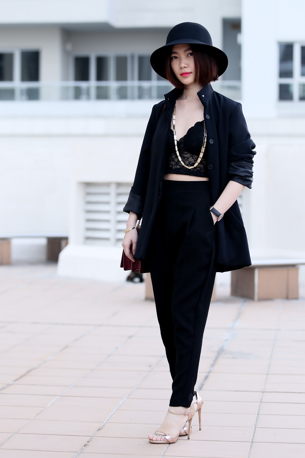 | Tín đồ thời trang này không ngại diện bra-top kết hợp cùng quần âu, giày cao gót. Tổng thể cây màu đen khá ấn tượng. |