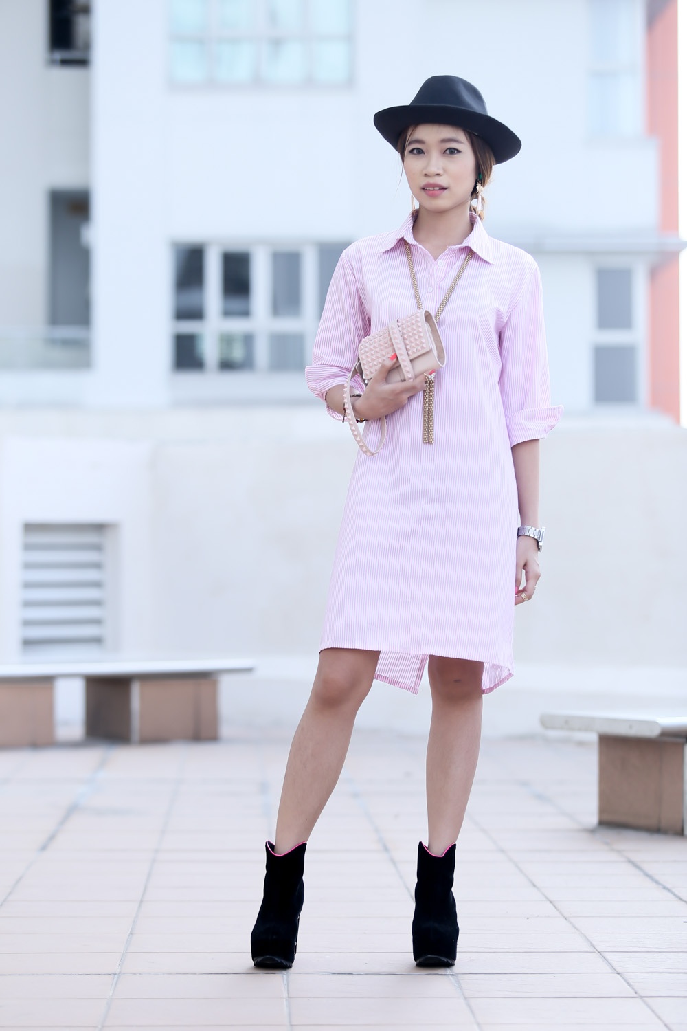 | Mốt thời trang "giấu quần" được tín đồ này ứng dụng hiệu quả. Cô mix tinh tế cùng phụ kiện clutch đồng màu và dây cổ phá cách. |