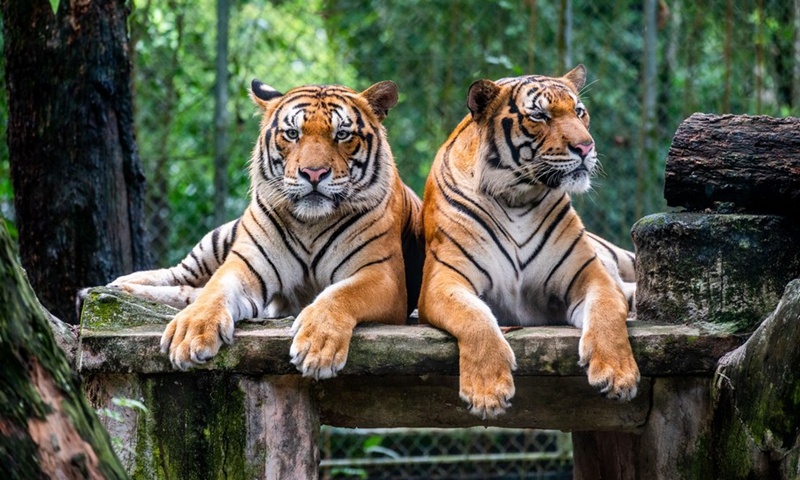 Hai con hổ Mã Lai Wira (trái) và Hebat nghỉ ngơi trong chuồng tại vườn thú Negara gần Kuala Lumpur, Malaysia, năm 2022. Ảnh: Tân Hoa Xã. |