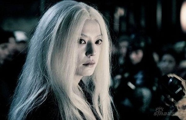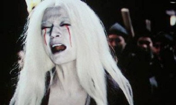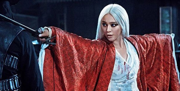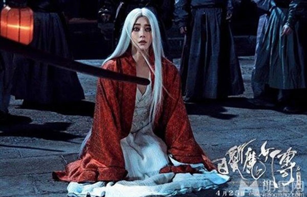 | Ma nữ Triệu Vy với mái tóc trắng, khuôn mặt trắng bệch và đôi mắt rỉ máu trong Họa Bì. |