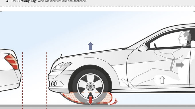 Mercedes-Benz đang nghiên cứu cách sử dụng túi khí mới, biến chúng trở thành một phần của hệ thống an toàn chủ động trên xe. Cụ thể, Mercedes-Benz đặt các túi khí ở bên dưới xe, khi các cảm biến trên xe xác định sắp xảy ra va chạm, các túi khí này sẽ tự động bung ra giúp dừng xe lại. Túi khí cũng sẽ nâng xe lên 8 cm khi phanh gấp nhằm giảm quán tính cho hành khách cũng như giảm lực va chạm nhằm giúp hành khách không bị trượt khỏi dây an toàn.
